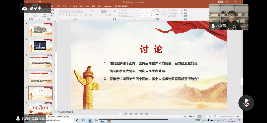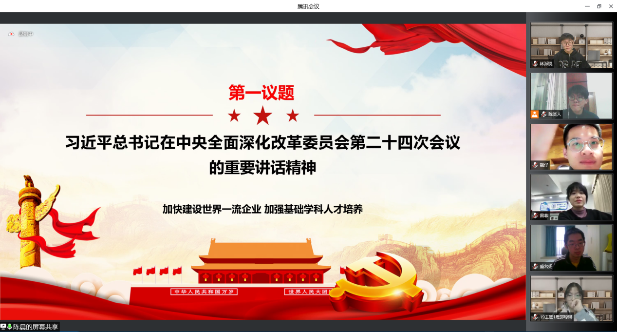 会上,首先党支部书记雷菲进行了“第一议题”的学习:学习贯彻习近平总书记在中央全面深化改革委员会第二十四次会议上的重要讲话精神。并从“如何理解四个面向”、“青年学生如何结合四个面向,将个人追求与国家需求紧密结合”展开了讨论。
