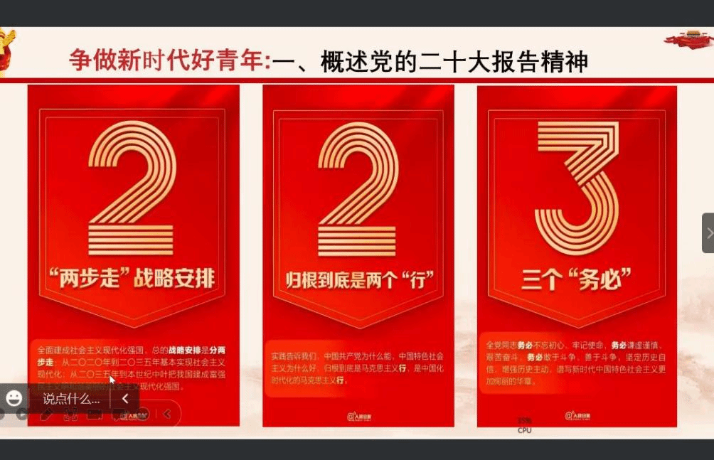 紧接着诸小妮老师结合学生工作与我们分享了对二十大报告的深度认识,从时代变化和新时代青年大学生蜕变出发,深刻阐述了何为当代大学生,当代大学生如何乘党的二十大之风,扬起中华民族伟大复兴之帆,走在时代的前沿,为党和国家做出贡献。诸小妮老师的讲述激起了学员们浓厚的兴趣,在课堂评论区发表了众多观点,诸小妮老师也对学员们的观点进行了点评与深度拓展。