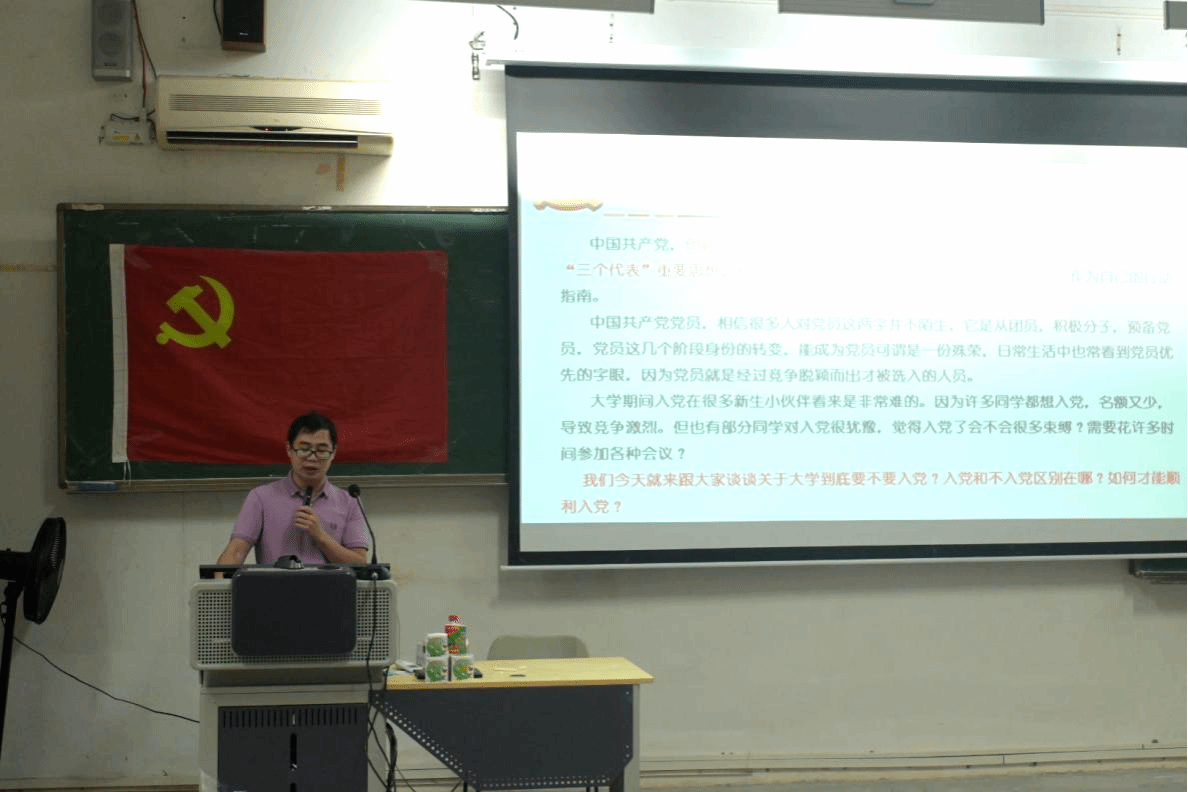 党委在6B101教室举办分党校第十四期入党积极分子培训班第二次专题党课,邀请校党委组织部科长刘远飞为学员们讲专题党课。