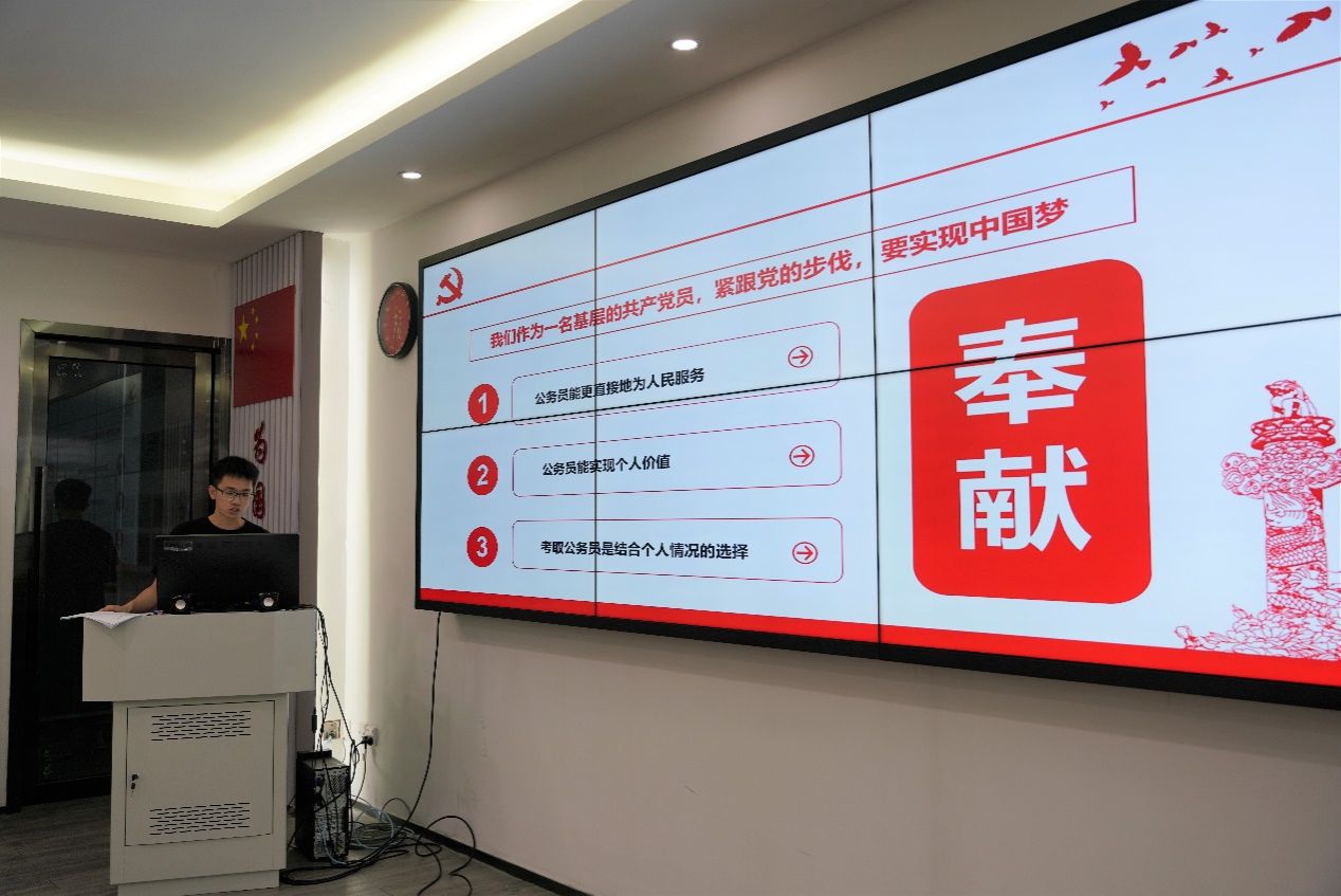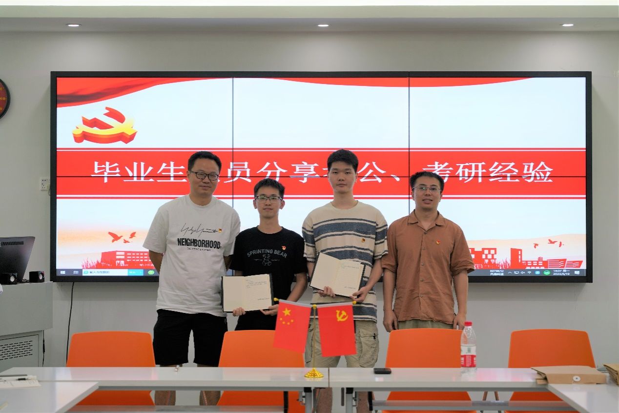接下来,毕业生党员容德旺同志和赵焌廷同志分享了考公、考研的经验和心得。容德旺通过广东省2023年度选调优秀大学毕业生考试的选拔,即将成为一名基层公务员。他从“为什么考公”、“考取公务员的途径”、“如何备考”以及“关于主题教育的思考”分享了自己的经验和心得,“考取公务员是为了能够更直接的为人民服务,实现个人价值”容德旺同志在会议上说。赵焌廷考取了广州大学结构工程学术型硕士研究生,“考研的旅途很美,结果很重要,沿途的风景也值得停下来欣赏”是赵焌廷同志在考研生涯的最大感悟,也提醒正在备战考研的同志一定要有明确的目标以及准确的自我定位。