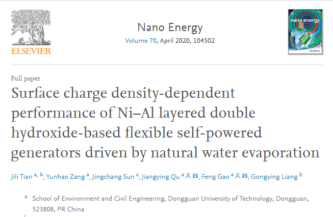 田吉利博士后(合作导师曲江英和梁工英教授)以影响水蒸发驱动微流体发电的一个关键因素—材料表面电荷密度为切入点,精确调控Ni-Al LDHs表面电荷密度,在PET表面组装了具有高稳定性的柔性水蒸发驱动微流体发电机,首次系统研究了不同表面电荷密度对器件发电性能的影响。在此基础上,通过优化器件的结构和组装方式,利用水蒸发发电成功驱动一个儿童手表正常工作,如图所示(Nano Energy, 2020, 70: 104502,第一单位,通讯作者为曲江英教授和高峰副教授)。该成果是课题组前期工作的深化研究,前期以层状双金属氢氧化物(LDHs)为发电材料,成功构筑了水蒸发驱动的柔性发动机,实现了水蒸发能转化为电能(Nano Energy,2019, 57: 269,第二单位)。
