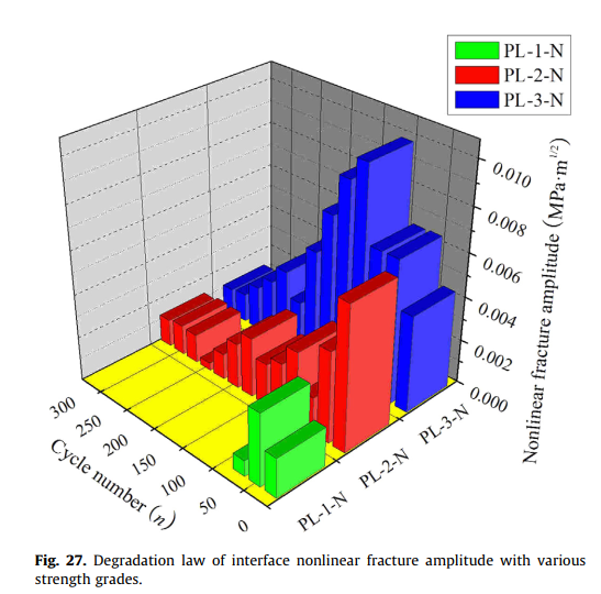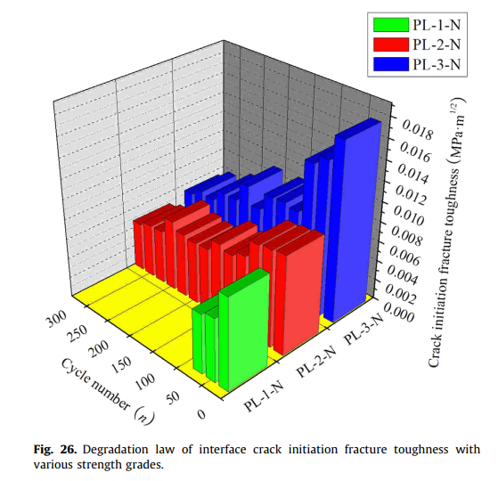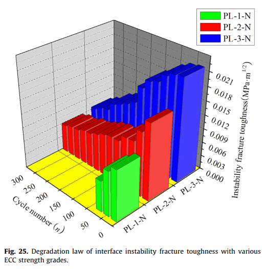田俊、郑愚、马宏伟、吴晓伟、孙璨、黄文通等人开展盐冻融作用下ECC与混凝土界面断裂特性的试验研究,得到了盐冻融作用对ECC与混凝土界面的荷载-裂缝张口位移曲线、极限劈裂荷载、极限裂缝张口位移等断裂特性的影响规律。试验结果表明,无论是否经历盐冻融循环,ECC与混凝土界面的断裂特性均表现出明显的非线性,因此本研究创新性的提出了三参数断裂模型(即起裂断裂韧度、失稳断裂韧度、非线性断裂幅值)进行描述界面的非线性断裂特性。利用断裂力学的相关理论,推导出了界面起裂断裂韧度、失稳断裂韧度、非线性断裂幅值的解析计算公式,在盐冻融循环作用下界面起裂断裂韧度、失稳断裂韧度、非线性断裂幅值的变化情况能够全面、准确的反映界面断裂特性的退化规律,进而敏感、准确、全面的分析了界面断裂特性的退化规律。