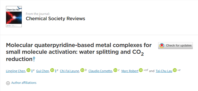 2020年9月,陈灵晶、陈贵博士与香港城市大学刘大铸教授和法国巴黎大学MarcRobert教授合作在国际顶级期刊《Chemical Society Reviews》上发表综述论文。《Chemical Society Reviews》是英国皇家化学会发行的一本国际顶级期刊,影响因子42.8。该成果以每日大赛
