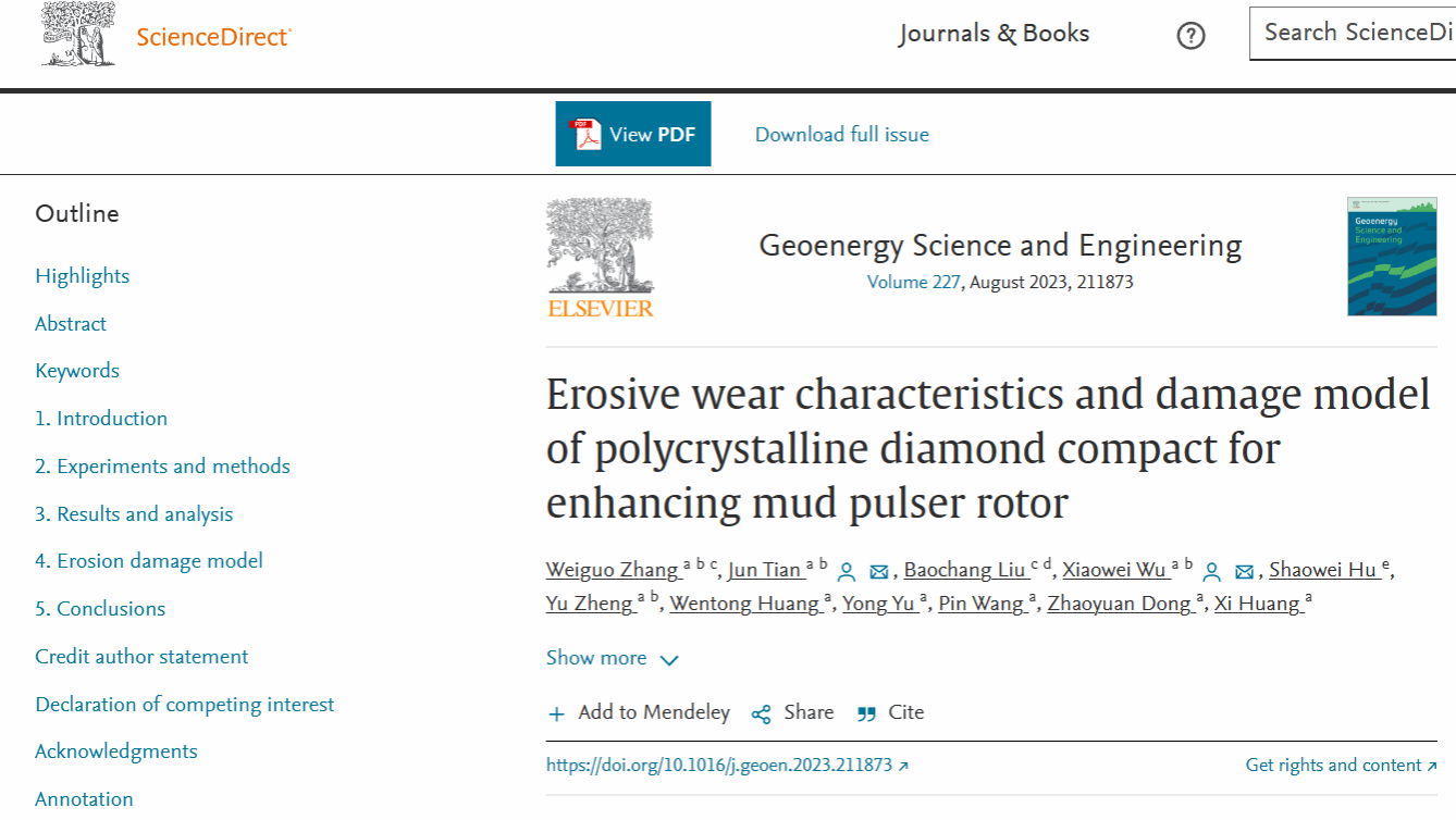 张维国博士后、田俊副教授、吴晓伟特聘副教授、郑愚教授、黄文通副教授、余勇特聘副教授等人在《Geoenergy Science and Engineering》(GEOEN,原Journal of Petroleum Science and Engineering,2023年改为现刊名)发表题为《Erosive wear characteristics and damage model of polycrystalline diamond compact for enhancing mud pulser rotor》的论文;该研究成果以每日大赛