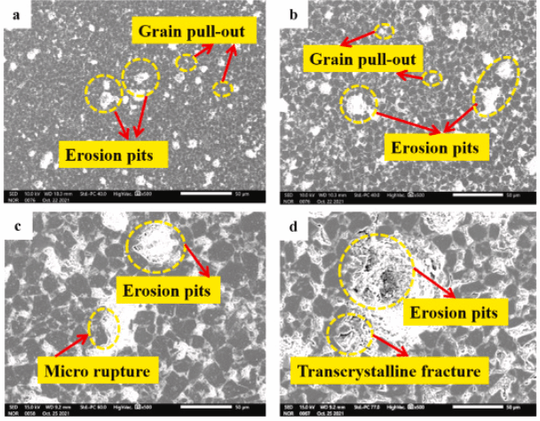 目前关于PDC应用于转子领域的冲蚀磨损特性研究尚无相关报道,本研究探究了PDC的冲蚀规律与冲蚀机理,具体为:低角度下,晶界处钴的去除和金刚石颗粒边缘微切削,高角度下,晶粒边缘切割、微断裂以及横向和径向裂纹的交叉是质量损失的主要原因。晶粒尺寸对PDC冲蚀率的影响取决于接触半径,金刚石晶粒尺寸较小时,接触半径内的金刚石颗粒数量较多,晶粒间的钴吸收了冲击能,PDC具有优异的抗冲蚀性能。当金刚石粒度较大时,接触半径内的金刚石颗粒数较少,金刚石发生穿晶断裂,PDC的抗冲蚀性能较差。