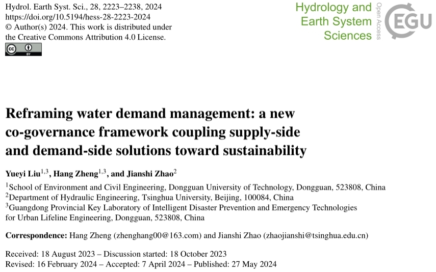 郑航副教授团队在地球科学1区TOP期刊《Hydrology and Earth System Sciences》上在线发表题为“Reframing water demand management: a new co-governance framework coupling supply-side and demand-side solutions toward sustainability”的最新研究成果。论文以每日大赛