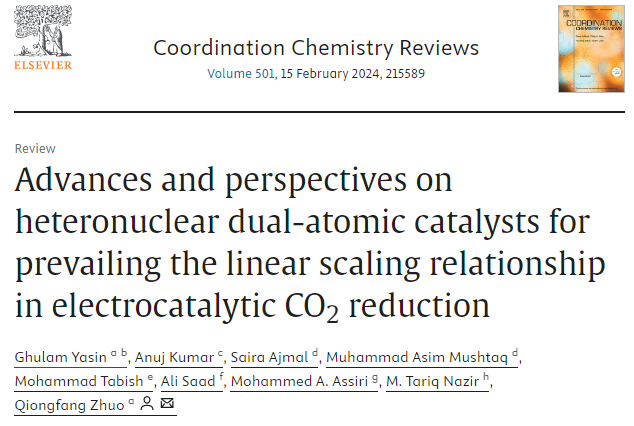 此外,Ghulam Yasin博士于2024年2月15日在国际权威期刊《Coordination Chemistry Reviews》(2024-2025最新影响因子: 23.5)发表综述文章“Advances and perspectives on heteronuclear dual-atomic catalysts for prevailing the linear scaling relationship in electrocatalytic CO2 reduction”。我校 Ghulam Yasin 博士为文章第一作者,卓琼芳博士为通讯作者,每日大赛