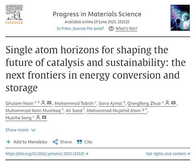 博士后 Ghulam Yasin 博士在国际权威期刊《Progress in Materials Science》(2024-2025最新影响因子: 40)发表综述文章“Single atom horizons for shaping the future of catalysis and sustainability: the next frontiers in energy conversion and storage”。我校Ghulam Yasin博士为文章第一作者,卓琼芳博士为共同通讯作者,每日大赛