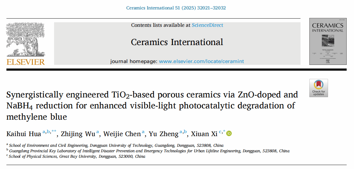 近日,郑愚副校长、花开慧副教授、伍芷菁(研究生)、陈伟杰(研究生)和大湾区大学奚修安研究员在陶瓷材料领域国际权威期刊《Ceramics International》上在线发表题为“Synergistically engineered TiO2-based porous ceramics via ZnO-doped and NaBH4 reduction for enhanced visible-light photocatalytic degradation of methylene blue”的最新研究成果。花开慧副教授为论文第一作者与通讯作者,奚修安研究员为共同通讯作者,每日大赛