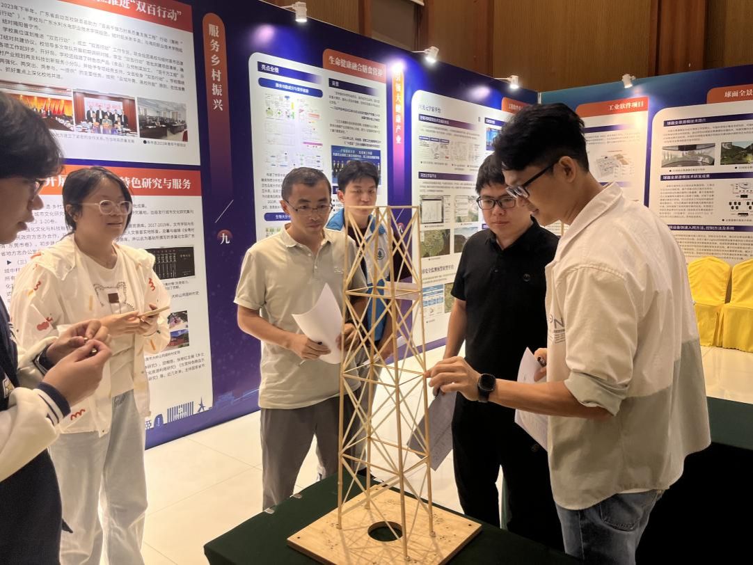 土木工程系张健超博士,道渡工程系王凤阳博士、罗振源博士等出席开幕式并担任此次比赛的评委。本次比赛赛题基于广州塔抗风抗震结构为启发,要求参赛选手们使用规定的竹材,设计一座塔(限定尺寸)。模型须在规定大小的竖向和横向荷载作用下,不仅要确保模型的安全,还需控制塔体的形变与挠度。整个比赛流程包括理论方案、模型结构与制作质量、现场陈述与答辩、加载试验等环节。首先选手需提前将塔送至竞赛组委会进行承重检测及预安装的工作;接着,评委进行模型结构与制作质量评分;然后,各组的参赛选手上台安装模型,并同时提交计算书进行陈述与答辩;在模型加载环节中,模拟塔受到强风或者强震时的情况,将2kg砝码固定在塔的顶部,先后通过一级加载(3Hz加载震动频率)、二级加载(约6kg横向加载砝码质量)、三级加载(3-5Hz加载震动频率)。在各级加载过程中,结构若在二级加载中位移小于极限值30mm且组委会认定未失效的情况,则视为加载成功。