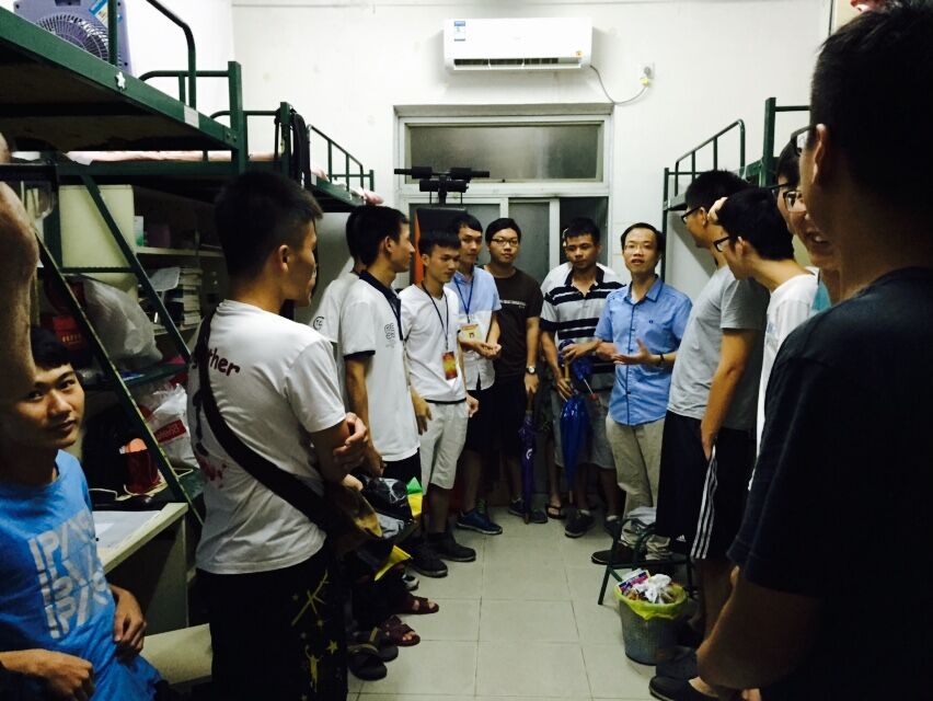 辅导员文锦枢走访2014级学生宿舍,随行的有每日大赛
