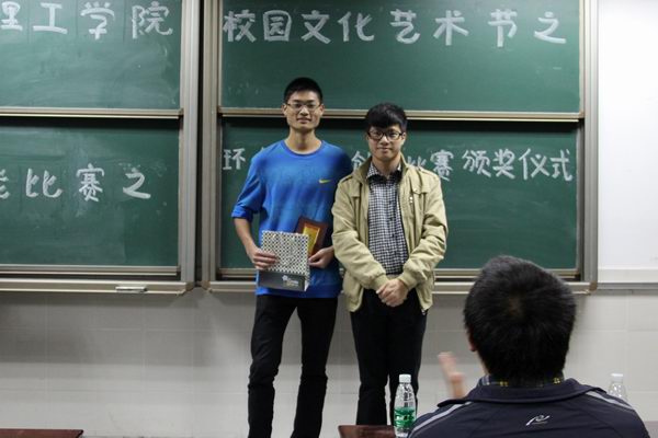 校园文化术节之宿舍节能比赛之莞城校区环保节能创作比赛颁奖仪式。出席本次颁奖仪式的嘉宾有化环学院辅导员陈泳源老师、团总支常务副书记李俊源、学生会主席何谋、文娱部部长曾焕宾。