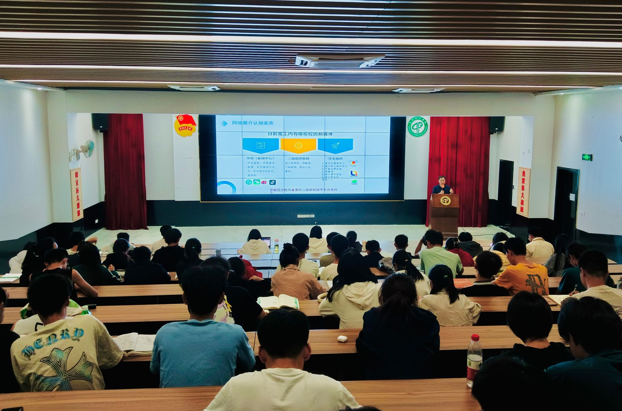 会议进入第二个部分,李春志老师为同学们带来题为“提升媒介素养 共建网络文明”的大学生网络媒介素养专题教育,主要从“网络媒介认知辨别能力、网络媒介法律道德、网络信息运用、网络安全意识”等四个方面,对大学生提升自身网络媒介素养的必要性展开具体阐述。