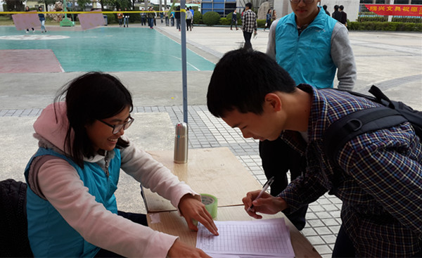 团总支志愿服务站分别在莞城校区的一期饭堂前、图书馆前篮球场设置摊位对即将开展的“DIY环保时装秀”活动进行宣传,让更多的人意识到环保的重要性。