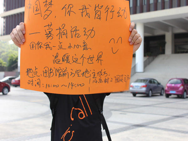 首先,在团支书书记陈铁的分配下,该团支部分为两个小组。一个小组驻扎大本营,负责接收募捐物并登记募捐者的姓名、募捐物及数量。另一个小组团员主要分布在莞城校区四号楼大厅、校道及北门门口对本校学生及附近居民宣传募捐。