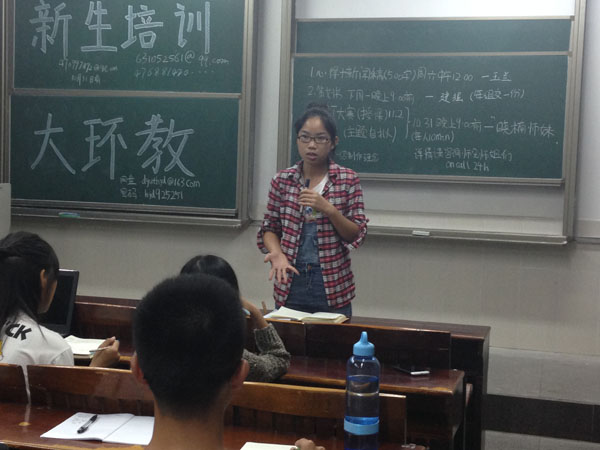 首先,副部长杨建强负责讲解策划书的撰写及报销细则和相关注意事宜。接下来就是高级干事辜永基向新团干们讲解接人待物的礼仪问题,因为是否具有良好的礼仪不仅仅是代表着大学生的风貌,更是向外界显示环教队的形象。PPT制作及授课技巧的培训是由副部长史晓楠负责讲解,她通过上一届PPT大赛的一个参赛作品系统而全面地教授新团干PPT的制作,期间灵活穿插讲解授课技巧,令新团干迅速了解PPT的制作以及授课技巧。十分钟的休息后,高级干事梁韵琪开始海报制作的培训,着重介绍了海报的制作特征是需要突出重点,吸引眼球。最后一个培训是由副部长陈玉兰讲解新闻稿的写作,除了教授新闻稿的基本知识之外,还详细地介绍部门常用的新闻体裁消息的写作要求,并布置了有关策划书、PPT和新闻稿的任务。