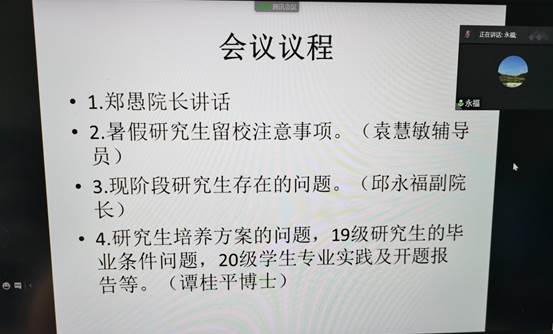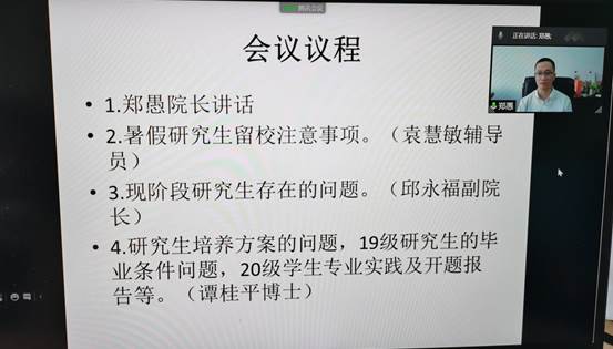 会议中,郑院长进行了动员讲话,袁慧敏老师向导师们讲解暑假研究生留校的注意事项,邱永福副院长向各位导师简述了现阶段研究生反映的一些问题,希望导师们除了关注研究生的学业和科研外,更应该关系他们的生活及将来毕业就业等问题。最后,由谭桂平博士向各位导师讲解了研究生培养方案的制订、19级研究生的专业实践报告及毕业条件等问题和20级学生专业实践协议签订及开题报告预备工作等安排。数十位资源与环境学位点的硕士研究生导师参加了本次网络会议。