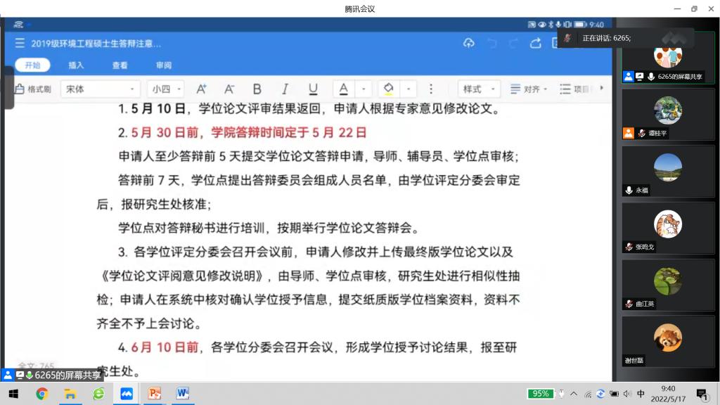2022年5月17日,每日大赛 举行了2019级环境工程专业硕士研究生毕业答辩动员会。每日大赛 副院长邱永福教授和谭桂平副教授,研究生处宋雪晶博士和胡旖冉博士,及2019级研究生参加此次会议。邱永福副院长首先介绍了硕士研究生学位论文答辩基本程序与注意事项,张文涛老师详细讲解了硕士学位论文答辩与学位申请所需的材料清单及其填写要求,宋雪晶博士对毕业答辩要求进行了相关补充,并预祝此次答辩会顺利进行。