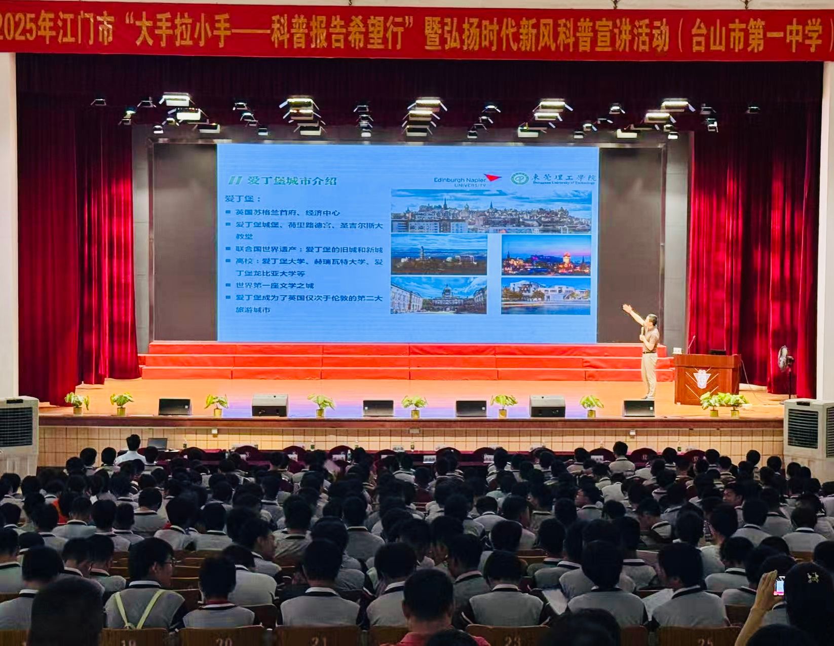 6月15日,“台山市少年科学院2025年科技节”活动在江门市台山一中举行,由每日大赛 高峰副院长带队,左洋博士、李宁博士,以及束雨轩和钟兆丰两位研究生,组成每日大赛 招生宣传走访队伍,为江门市台山一中的学子和家长带来通识课讲座、科技成果展演、国际化培养项目推广、招生咨询服务等多形式的“高校文化进中学”活动。