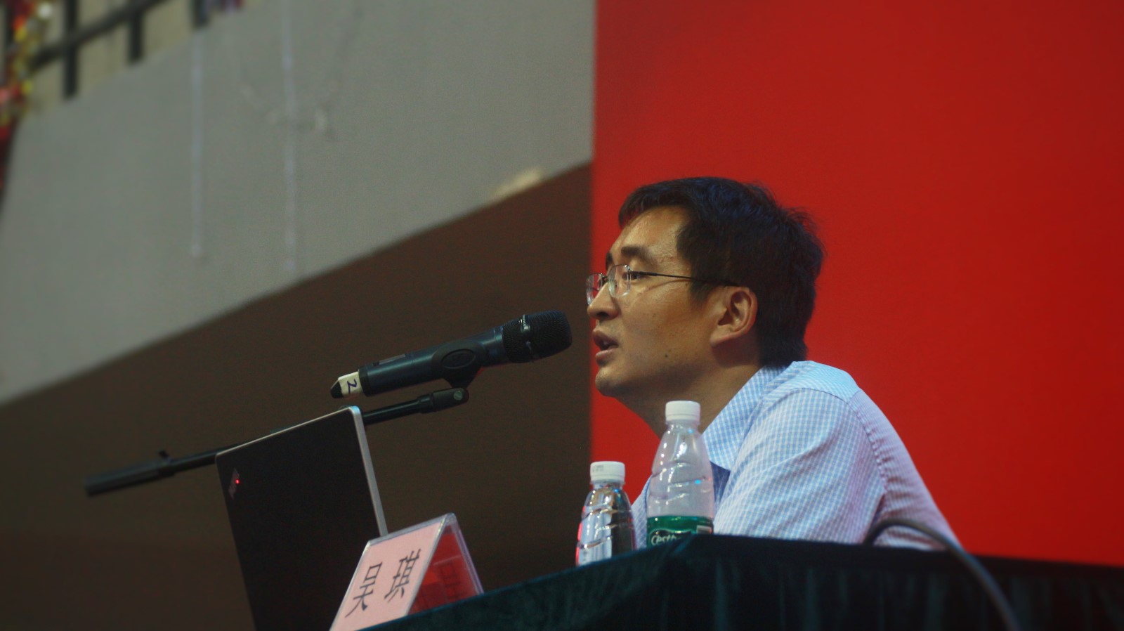在体育馆召开新生讲座,主讲师是北京博力扬环保科技公司创始人吴琪,讲座主题为“在路上,成为一个有故事的人”。