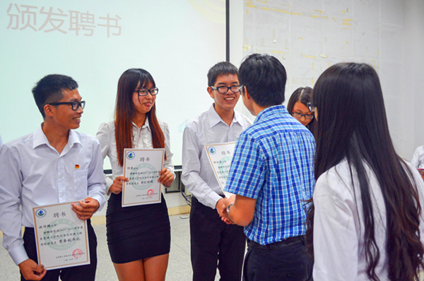 辅导员文锦枢老师与陈泳源老师轮流上台为团总支第十届第一、第二任主要团干颁发聘书。此后大会播放了团总支第十届第一任全体成员为下任成员特别录制的寄语视频,视频中无不体现了老干部对新干部的期望和关爱。