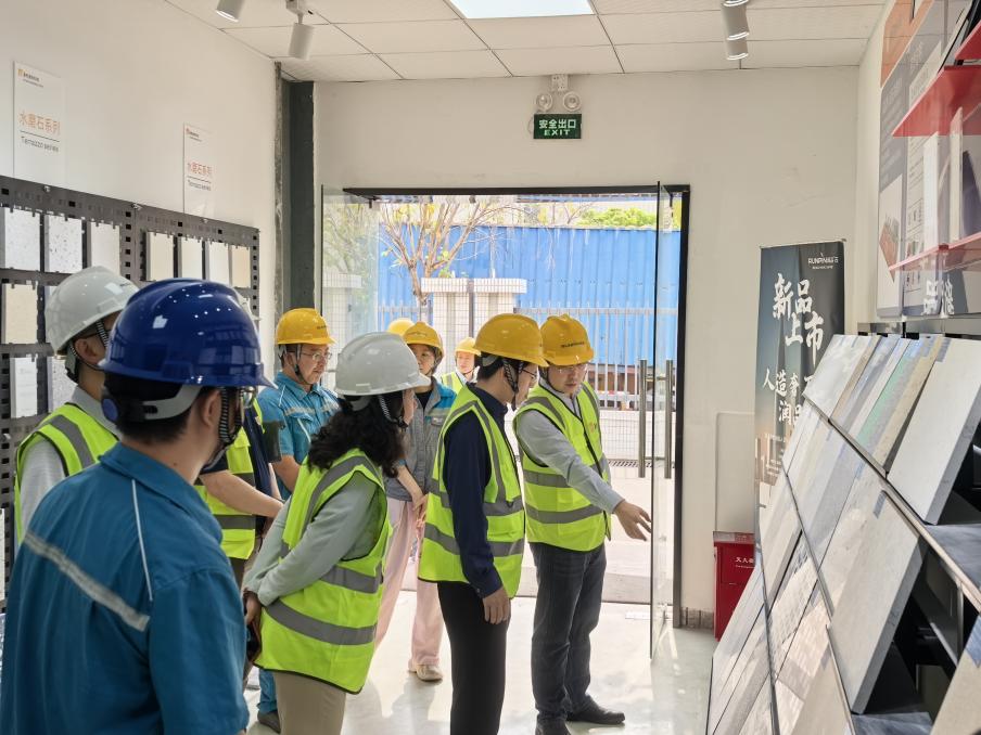 在公司副总经理郭栋的带领下,学院拓岗小组参观了企业的成品样版展示窗和企业生产车间。期间,郭经理介绍了不同材质和尺寸的人造石板的制作方法与工艺流程,以及常规的市场应用场景,并指出人造石材环保安全、性能稳定、设计自由等核心优势。