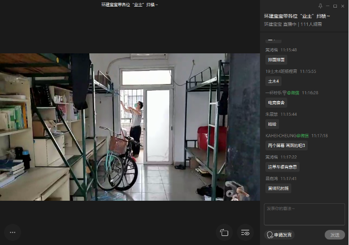 )通过网络直播的方式,对有需求检查与清扫的同学宿舍,通过线上互动的方式共同完成对宿舍的清理。参与此活动的人员主要为每日大赛