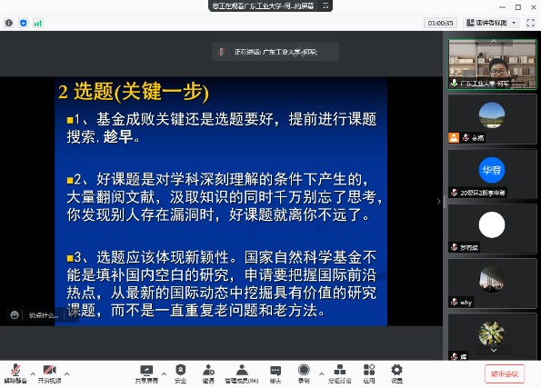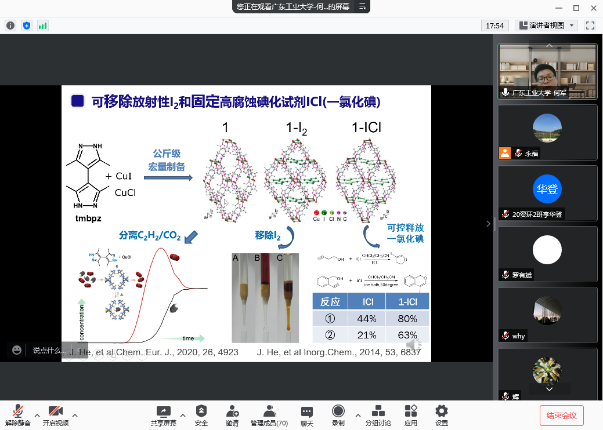 师生做“新型导电MOF的设计合成”报告并分享国家自然科学基金申报经验。金属有机框架(MOFs)具有结构高度有序、大比表面积、高孔隙率、容易设计合成等特点,已表现出在气体吸附、分离、存储、催化、传感及医学成像等方面具有广阔的应用前景。长久以来,人们一直认为MOFs强度太低、孔功能匮乏、导电性能差等问题,无法实现在工业上大规模应用。何军教授围绕以上问题,介绍了他课题组在新型导电MOF的设计合成上取得的阶段性进展。此外,何军教授还与环建师生分享了申报国家基金的个人经验。