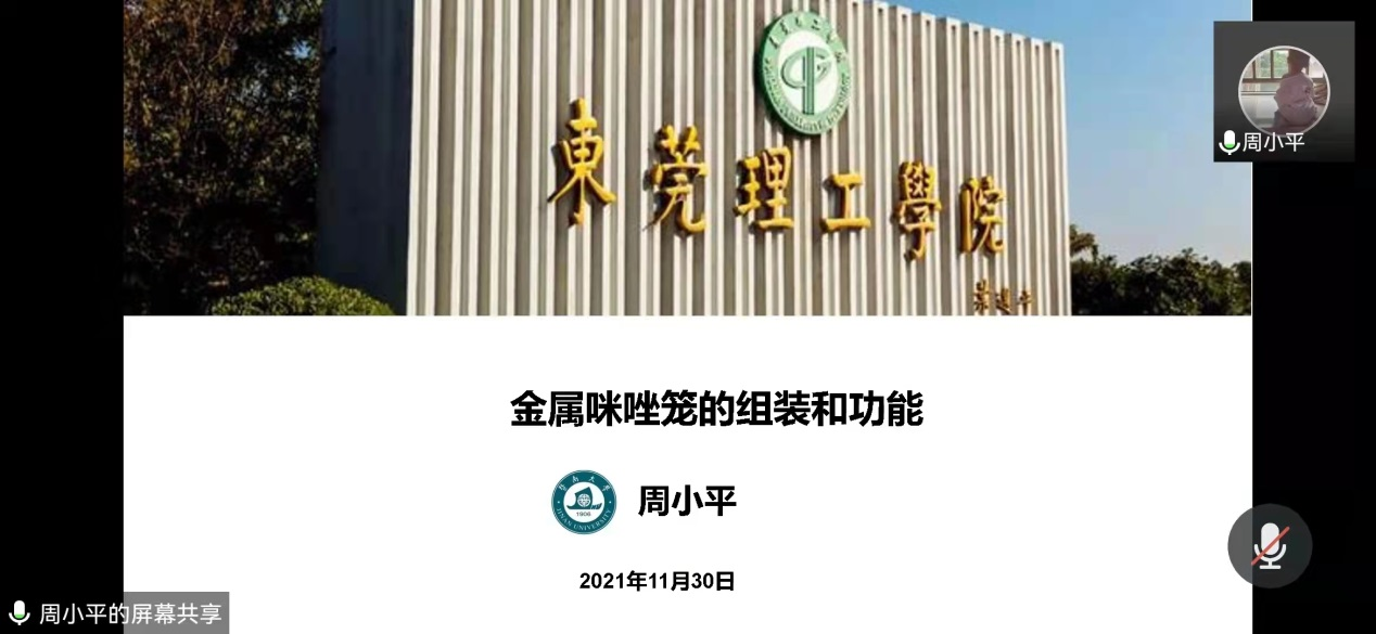师生做了题为“金属咪唑笼的组装与功能”的线上报告。在报告中,周教授为我们介绍了金属有机笼的合成方法及性质特点,并重点介绍了该类化合物作为类芬顿光催化剂,用来高效降解罗丹明B的应用。学术报告结束后,周教授以国家自然科学基金项目申请人的身份,与大家分享了申请国基的经验,另外还以国基评审人的角色,介绍了国基申报书存在的一些通病,让大家引以为戒。学术交流及经验分享会的气氛热烈,收到了很好的效果。