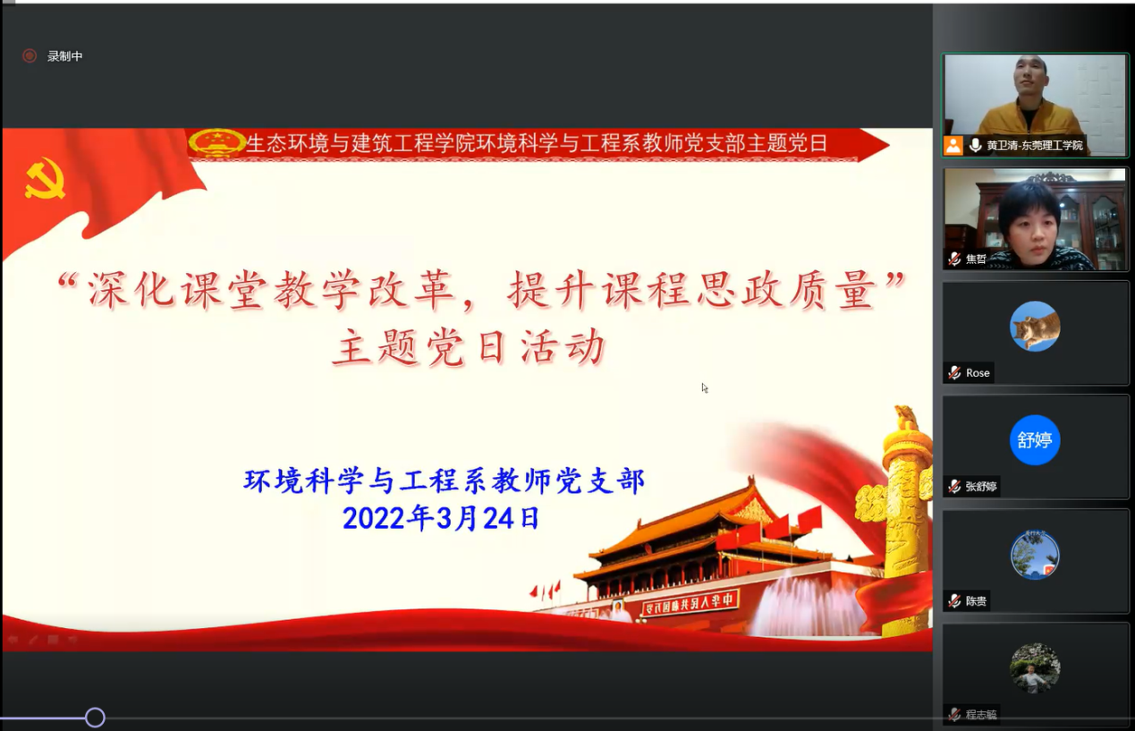 环境科学与工程系教师党支部开展了“深化课堂教学改革,提升课程思政质量”教育教学大讨论线上主题党日活动。党支部全体党员针对线上线下教学的区别结合环境学科课程特色对相关主题深度学习与研讨。