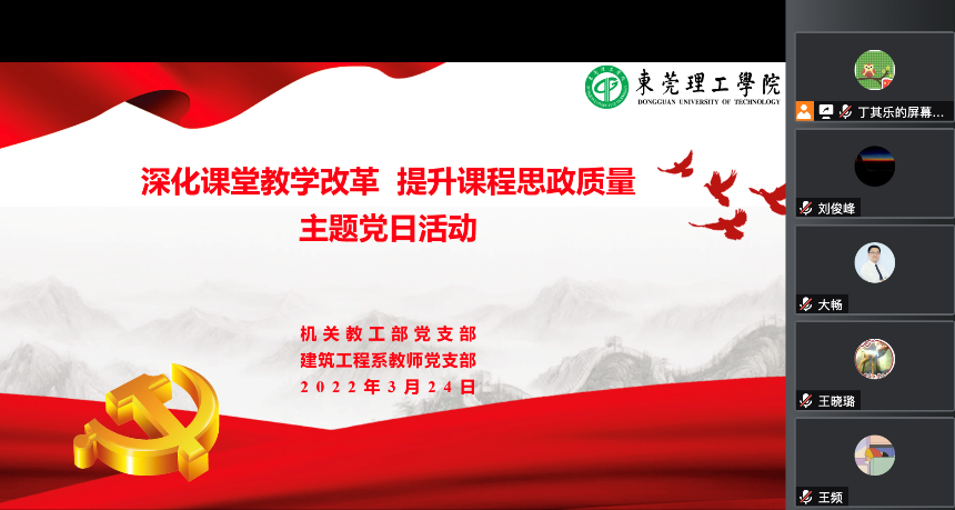 3月24日下午,建筑工程系教师党支部和机关教工部党支部共同开展了“深化课堂教学改革 提升课程思政质量”结对共建主题党日活动。会议由建筑工程系教师党支部书记丁其乐主持。