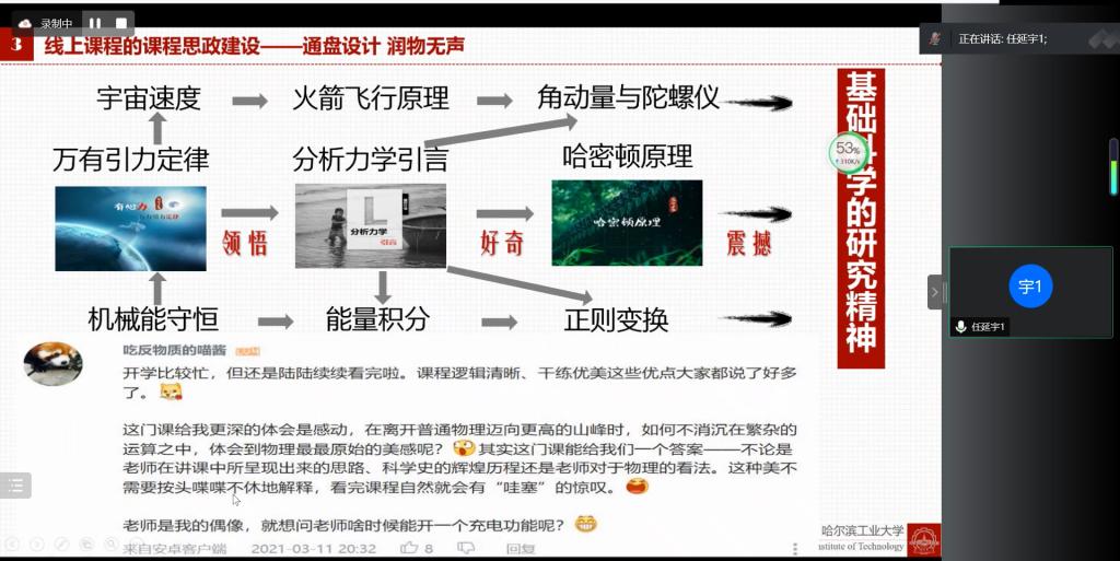 随后,任延宇教授从总体设计、实体课堂、线上课程、评价成效、总结展望五个方面来介绍课程思政建设。在总体设计方面,任教授认为理论力学作为“四大力学课程”的第一门课,数理逻辑比较强,数学推导比较复杂,学生容易产生畏难情绪。因此要以培养学生的科学精神为目的,让同学们认识到基础研究的重要性,青年教师需要提高自己的知识储备和底蕴,需要用几十个学时为学生奉献一个体系和一个理念,不仅要学生带来知识,还要带来震撼;在实体课堂方面,任教授通过举例展示,表示老师在教学过程中不仅介绍课程知识,更要介绍历史伟人追求真理的高尚情怀,让学生受到感染;在线上课程方面,任教授认为线上课程主要有受益面广,反馈及时,方便交流三个特点。在线上课程的制作过程中,不仅需要注重整门课的通盘设计,还需要注重PPT和板书,给学生带来比较好的第一印象。