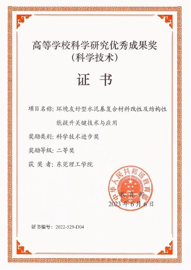 特聘教授田俊老师荣获2022年教育部高等学校科学研究优秀成果奖(科学技术)二等奖;获奖项目名称为:“环境友好型水泥基复合材料改性及结构性能提升关键技术与应用”。