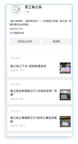 环境工程专业学生成立了“春之染”社会实践队,连续两年奔赴韶关曲江镇开展农村环境问题调研,并协助开展当地的助农帮扶工作,受到了当地政府和群众的广泛欢迎。(社会实践队活动内容详见“莞工春之染“公众号)