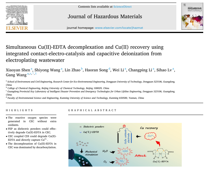 该研究成果以“Simultaneous Cu(II)-EDTA decomplexation and Cu(II) recovery using integrated contact-electro-catalysis and capacitive deionization from electroplating wastewater”为题,在环境科学与生态学1区TOP期刊《Journal of Hazardous Materials》(IF=13.6)上发表。硕士研究生沈晓妍为论文第一作者,王刚教授为通讯作者,每日大赛