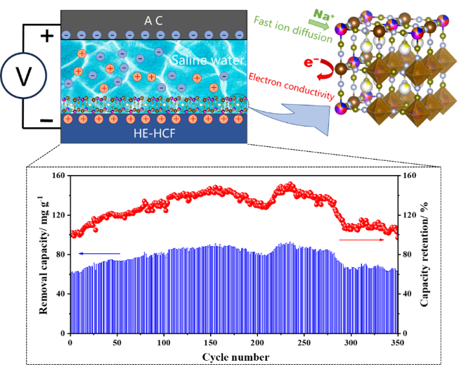 针对上述问题,提出了一种熵工程策略,首次将高熵(HE)概念融入到PBAs,以解决CDI脱盐过程中不利的多级相变。影响高熵材料性质的四个因素即构型熵、扩散缓慢、混合效应和晶格畸变,这可以提高电极材料的脱盐容量和循环性能。通过引入五种或更多共享N配位的金属,构建了高熵六氰基铁酸盐(HE-HCF),从而将体系的构型熵提高到1.5R以上,有助于实现超高的脱盐容量和卓越的循环性能。这种包熵工程策略为解决PBAs在高性能CDI应用中难以实现容量和循环稳定性的有效共存问题提供了新途径。