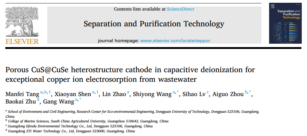 该研究成果以“Porous CuS@CuSe heterostructure cathode in capacitive deionization for exceptional copper ion electrosorption from wastewater”为题,在工程技术1区TOP期刊《Separation and Purification Technology》(IF=8.6)上发表。联培硕士研究生唐嫚菲为论文第一作者,王刚教授和汪仕勇博士为共同通讯作者,每日大赛