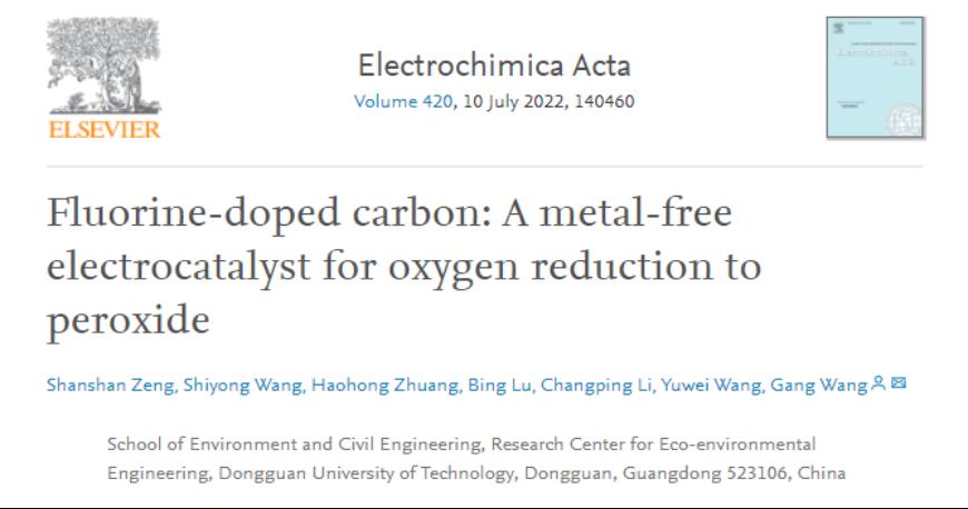 王刚教授课题组2019级硕士研究生曾珊珊在氟掺杂碳催化剂制备H2O2方面取得进展,研究成果以第一作者身份以“Fluorine-doped carbon: A metal-free electrocatalyst for oxygen reduction to peroxide”为题发表在电化学领域国际知名学术期刊《Electrochimica Acta》上。
